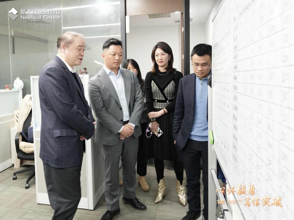 會議開始前,胡鋼董事長一行來到新大陸金融科技視察調研,與一線員工交流,了解業務開展情況,向員工們致以新春的問候,并針對產品、市場、風控、研發等不同業務條線的員工提出新要求、新期待。胡鋼認為,2025年將是AI應用的元年,新大陸已在多個領域開展AI應用的創新嘗試,金融科技同樣大有可為,希望全體員工積極擁抱AI、把握市場趨勢、強化團隊協作,以更大的凝聚力打造更強的戰斗力。