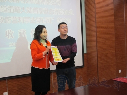 12月18日下午,由福建省臺聯牽線,大陸首家赴臺投資企業,福建新大陸科技集團向國家博物館捐贈赴臺投資“臺北縣政府營利事業登記證等”相關批準證書活動在福州馬尾新大陸科技園進行。
